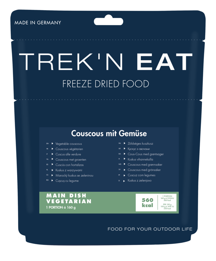 North African pleasure and refreshing vegetrian fare: The new Couscous with Vegetables is the perfect combo for everyone who wants to be fortified with extremely tasty meals when out and about. A variety of vegetables ensures fresh flavors that harmoniously combine traditional spices and couscous typical to North African cuisine. Simply pour boiling water into the resealable pouch to the fill line, stir, let it stand for a few minutes, and then enjoy the wafting smells reminiscent of Morocco. The light, low-fat meal from Trek’n Eat will be a must-have for every outdoor adventure.