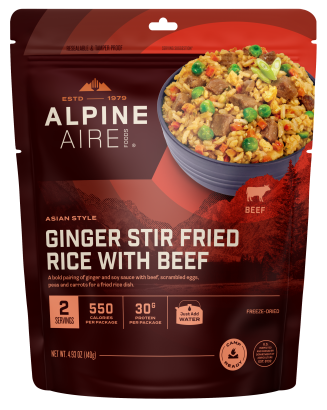 A bold pairing of ginger and soy sauce with beef, scrambled eggs, peas and carrots for a fried rice dish.