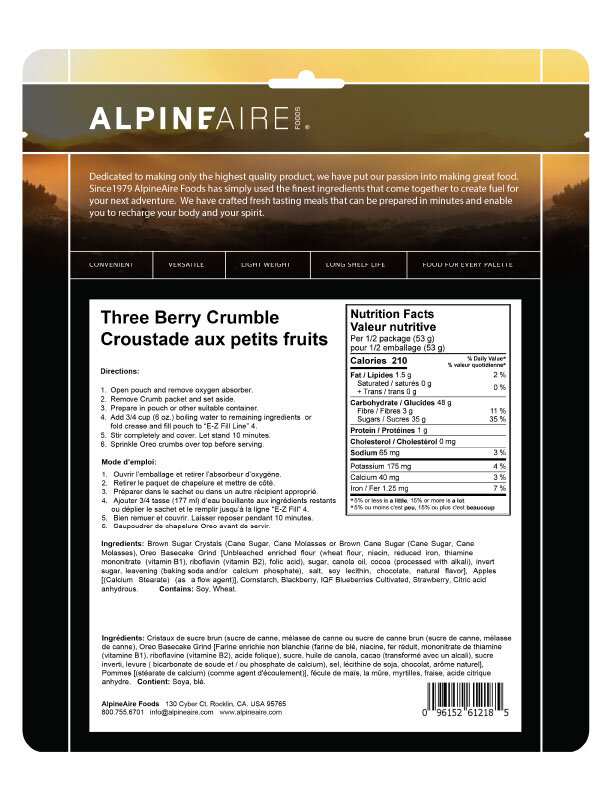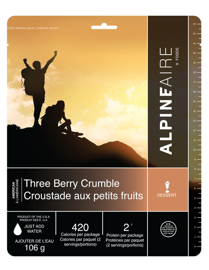Satisfy your craving on the trail or at the campsite quickly and easily with AlpineAire Foods Three Berry Crumble Dehydrated Food.
