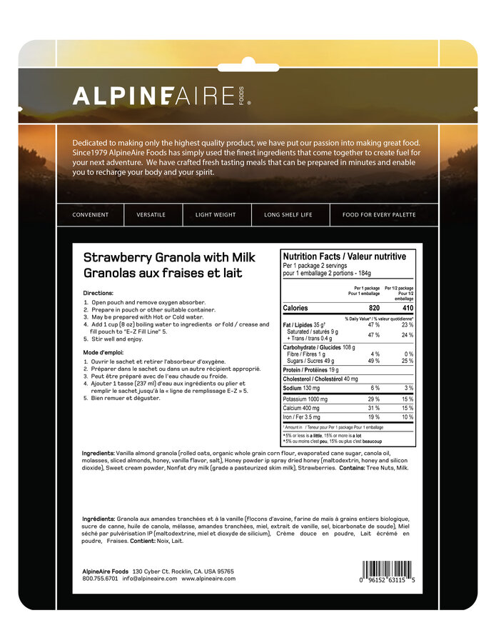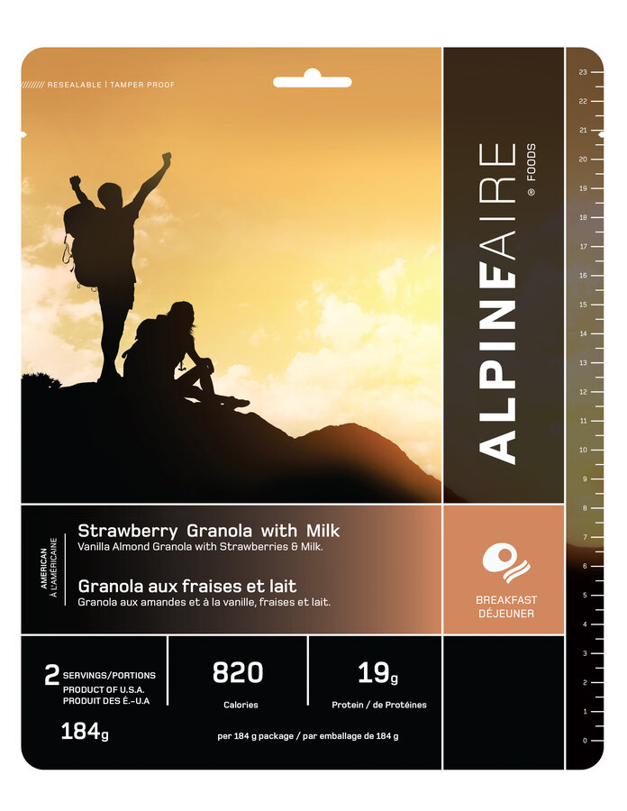 AlpineAire Foods Strawberry Granola with Milk is the perfect way to enjoy the food you love while backpacking. This AlpineAire shelf-stable meal is the perfect healthy breakfast, with sweet French vanilla granola, strawberries, and milk.