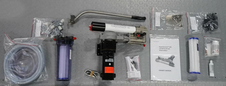 The world‘s smallest electrical desalinator. The 40E contains 40% fewer parts than its popular predecessor, the PowerSurvivor-35. Simplified construction and rugged design make the 40E remarkably easy to install, operate and maintain. Extraordinarily compact, the 40E can be installed in the nooks and crannies otherwise unusable in many yachts. No watermaker draws so few amps. Using only 4 amps, the 40E can run for extended periods on alternative power alone. The heart of the 40E is the rugged stainless high-pressure pump. Armed for the rigors of the marine environment, this watermaker is built to last. We're so certain, we've covered it with a superior Warranty: 3 years on most components. The PowerSurvivor-40E is the only power watermaker that converts to manual operation in emergencies.