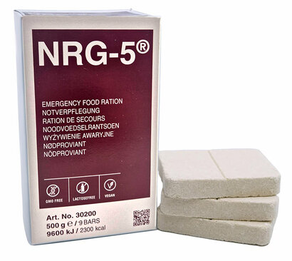 NRG-5® rations d'urgence avec des ingrédients de haute qualité. un Le pack NRG-5® (500g / 2300kcal) couvre les besoins énergétiques quotidiens un adulte. Immédiatement consommable, non chauffage ou cuisson nécessaire. Aussi pour les enfants de la 6ème mois convenable. Écraser les compresses bar et l'ajout d'eau peut être une bouillie nutritive ou jamais après avoir ajouté la quantité d'eau d'une boisson énergétique préparée.