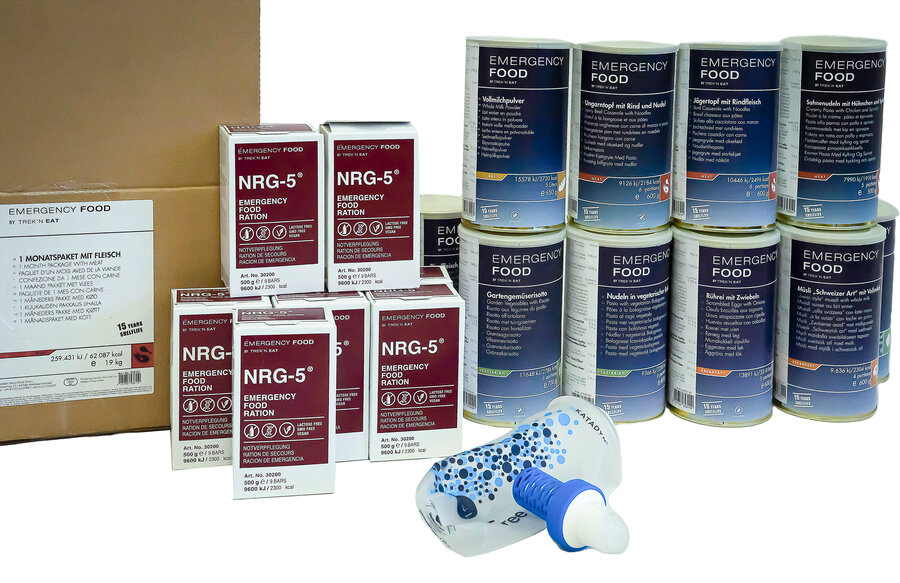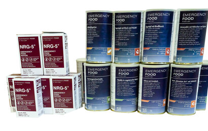 1 month package - with meat provides food for one person for 1 month. Our meat menus are made from high quality freeze-dried ingredients. This preserves vitamins and minerals. The meals do not contain any preservatives or added flavor enhancers and are free of hydrogenated fats. The menus also have a high calorie content and are expedition-safe and tropics-proof. All cans have tear-off lids and can be resealed with the accompanying plastic lids. The meals are filled in 1.2-liter cans under vacuum and nitrogen. This ensures a long-term shelf life of at least 15 years.