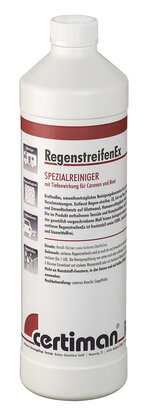 | Use | : | Depending on the type and intensity of the dirt, Certiman RegenstreifenEx can be diluted up to a ratio of 1:50. The cleaning product should be applied from the top down. Remove both the cleaning agent and dirt with a strong jet of water or a high-pressure cleaner after approximately three minutes. Do not use on plastic windows, in intense sunlight or on hot surfaces. |