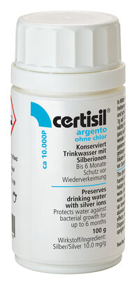 certisil® argento renders clear drinking water stable by means of silver ions and keeps it germ-free for 6 months. certisil® argento powder is used for treating large quantities of water, e.g. in camper vans or yachts. For tanks of at least 10 L up to 100.000 L or more.