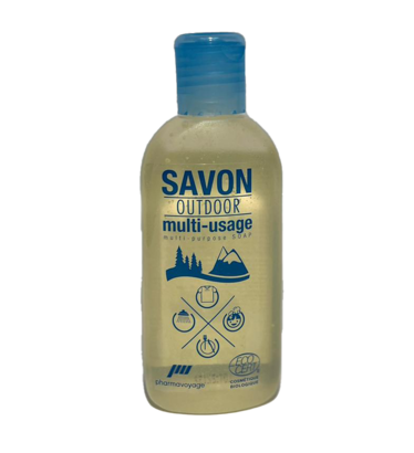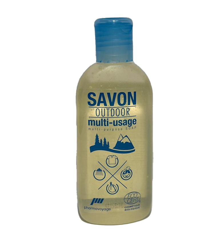 The Ecocert certified organic soap by Pharmavoyage is an outdoor, biodegradable and multi-purpose soap. The highly concentrated soap is suitable for washing the body, hair, clothes and dishes. It is ideal for hiking in the mountain or travelling. The soap may be used with fresh water or seawater.