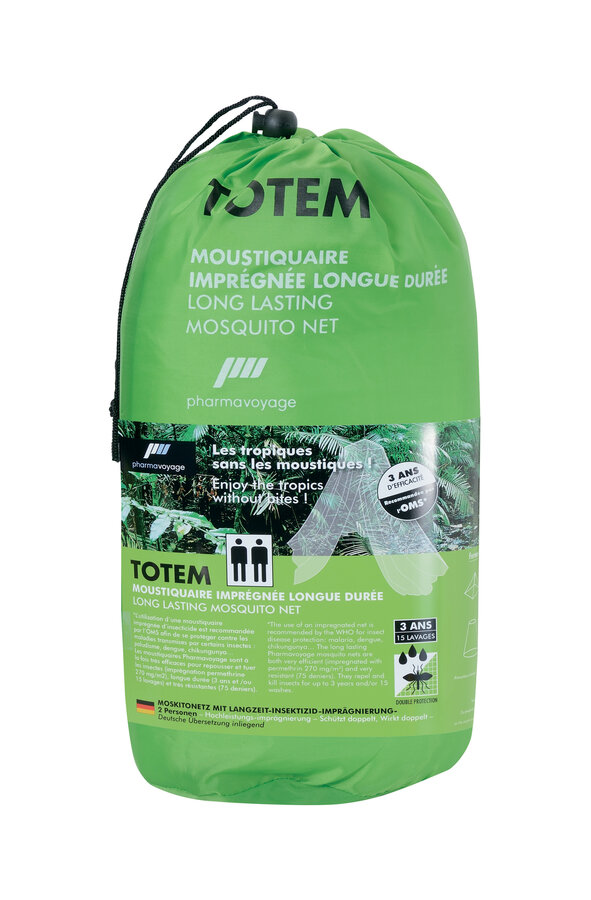 Thanks to its impregnation technology, the Pharmavoyage mosquito net is a so-called «long-lasting» mosquito net (270 mg permethrin) and is very resistant (75 denier). The use of an impregnated mosquito net is rec-ommended by WHO in order to protect against certain insectborne diseases: malaria, dengue, chikungunya, etc. Ideal for use in hotels or at home. Suitable for use with a double bed. Large and high living space.
