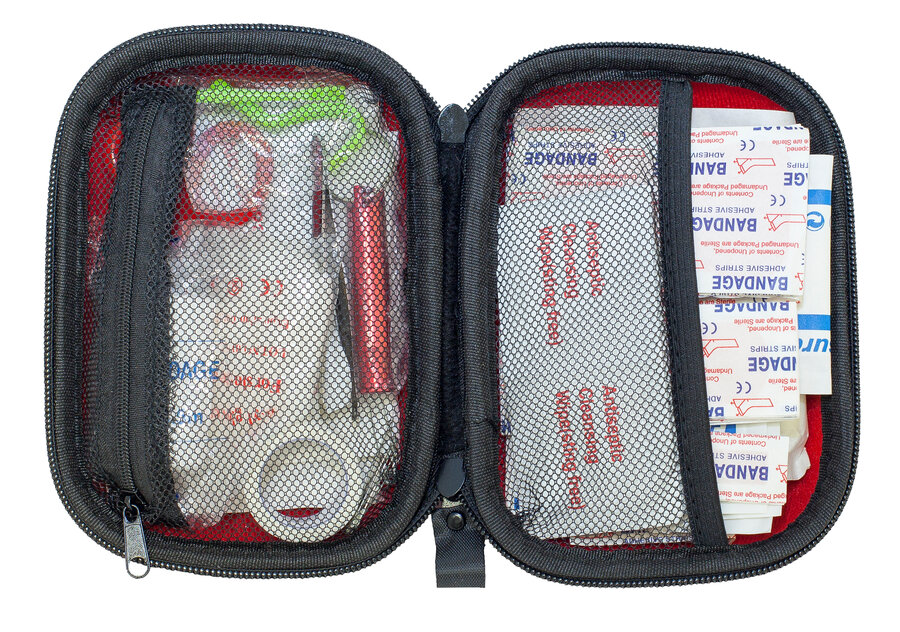 First-aid kit with semi-rigid shell : compact and well equipped. 60 integrated quality care products. Its durable shell protects the care products included and is therefore ideal in a suitcase for travel by train, plane or in a compartment of a car, van or camper. Its design is also suitable for camping.