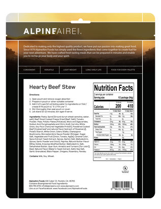 Bring the warmth of home to wherever your expedition may lead with AlpineAire’s Hearty Beef Stew! A warm and comforting peppery tomato-based beef stew with vegetables and noodles.